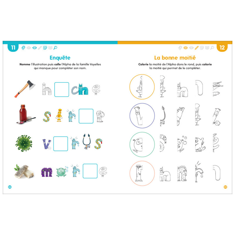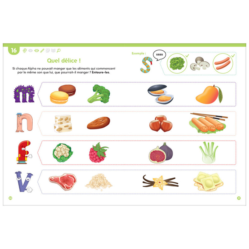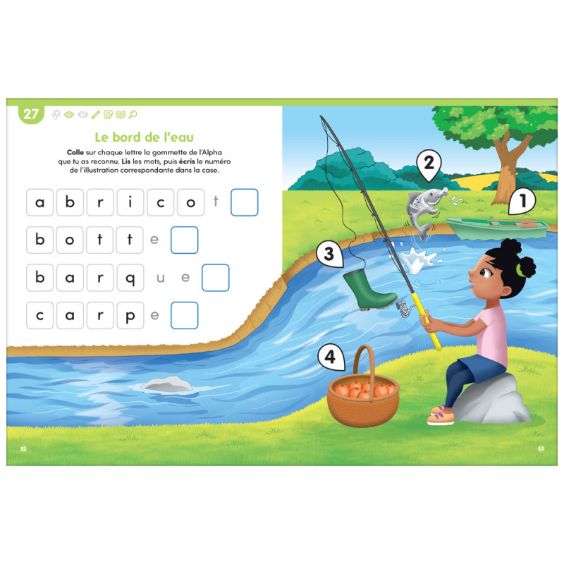 Chaque activité est soigneusement pensée pour associer jeu, observation, écoute, coloriage, manipulation, écriture et compréhension, afin de favoriser un apprentissage actif et motivant.