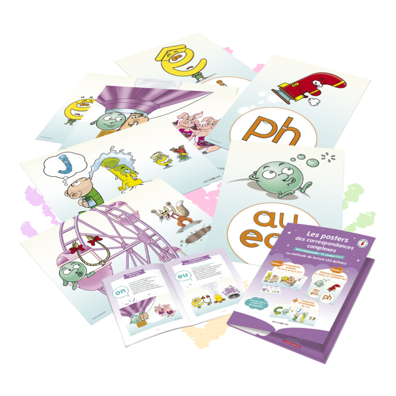 La pochette des posters des correspondances complexes Les Alphas – Nouvelle édition – contient 22 affiches pédagogiques au format A3. Elles couvrent l’ensemble des sons complexes ainsi que les consonnes contextuelles g, s et c, souvent délicates à maîtriser pour les jeunes lecteurs.